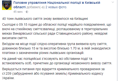Полицейские выясняют все обстоятельства происшествия и устанавливают лиц, причастных к организации незаконного вывоза мусора. Решается вопрос об открытии уголовного производства по ст.239 (загрязнение или порча земель) УК Украины.