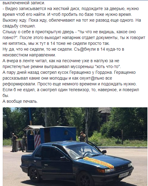 "Все. Война закончилась, реформа полиции прошла удачно. Славянск. Третий блокпост. На посту полицейские в камуфляже, ВСПшник и полицейские в черном/синем/х*рпоймешь. Последние - это переаттестованные гаишники. Гаишник от места проверки документов показывает леденцом подъехать к их скворешнику. Видит форму, зовет ВСПшника. ВСПшник пытается поумничать на предмет того, что ему положено досматривать и гражданские микроавтобусы, но проверив документы, отходит с словами - "у меня вопрос нет". И начинается классический разводняк. Предъявите документы на машину. Водительское. Пойдемте со мной", - пишет он.