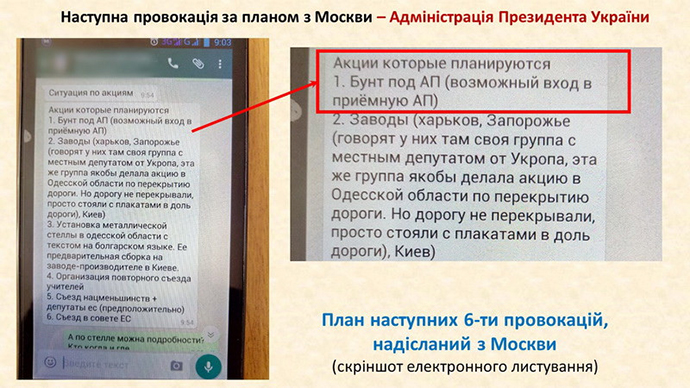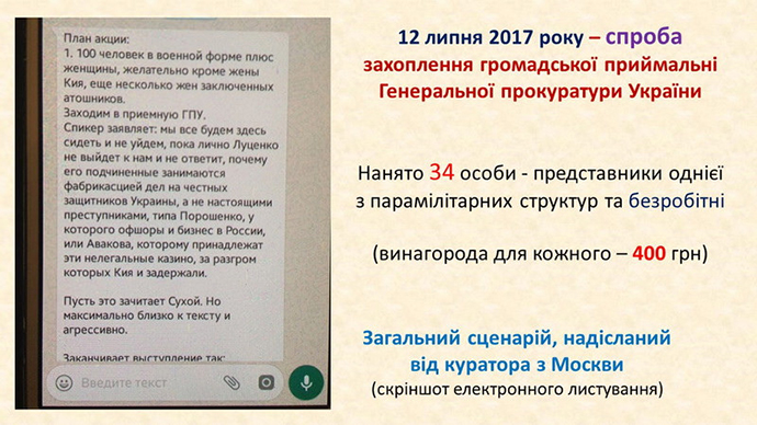 Службою безпеки задокументовано проведення інструктажу учасників та їхнє пересування до місця події. Того ж дня СБУ спільно з поліцією затримали 29 провокаторів. Серед них був і організатор акції, який вже надав свідчення про замовників