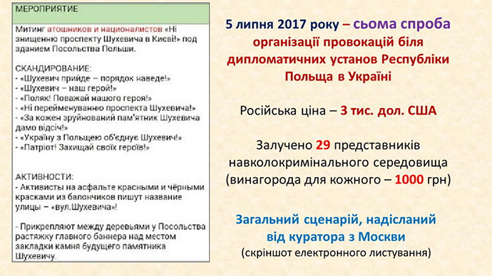 За його словами, лише впродовж тижня (з 28 червня по 4 липня 2017 року) Службою було викрито шість спроб російської сторони організувати акції протесту під Посольствам Республіки Польща в Україні. Координатори в РФ вимагали від своїх зв’язків у Києві провести акцію до роковин Волинської трагедії.
