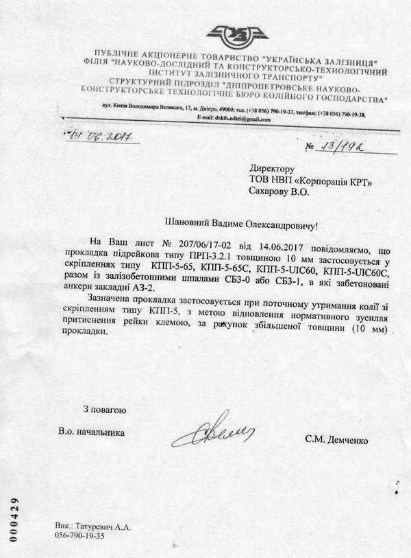 Подтверждения этому проявились в письме «Днепропетровского НКТБ путевого хозяйства», в котором железнодорожные ученые известили корпорацию «КРТ», что эти прокладки заказываются именно «с целью восстановления нормативного усилия прижатия рельса клеммой за счет увеличенной толщины (10 мм) прокладки». И указали, что речь идет именно о крепеже Дубневичей КПП-5: