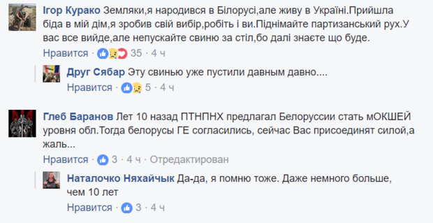 «Выходить после учений они не будут!! Будет сюжет как в Крыму. Сделают референдум и отожмут страну. Но самое интересное, что большая часть белорусов под псевдообещания о лучшей жизни мгновенно проголосуют за Россию… Эта падла усатая (подразумевается президент Беларуси Александр Лукашенко – ред.) за последним 10 лет по набрала долгов которые мы в жизни не отдадим и ко всему этому умудрился распродать практически 80% заводов и предприятий России!!!! Поэтому Россия, считай, является владельцем страны, только бумаги подписать нужно», — отметил он.