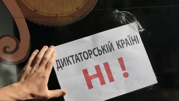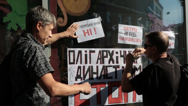 "Открытки с лозунгами "Диктаторской стране – НЕТ", "Петр, не будь Чаушеску", "Олигархическим династиям стоп" появились на витринах магазина Roshen. Также активисты оставили на тротуаре надпись "Срав пес на БПП", – говорится в сообщении.