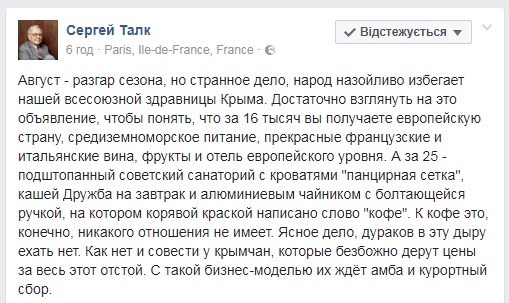 "К кофе это, конечно, никакого отношения не имеет. Ясное дело, дураков в эту дыру ехать нет. Как нет и совести у крымчан, которые безбожно дерут цены за весь этот отстой. С такой бизнес-моделью их ждёт амба и курортный сбор", - добавил он.