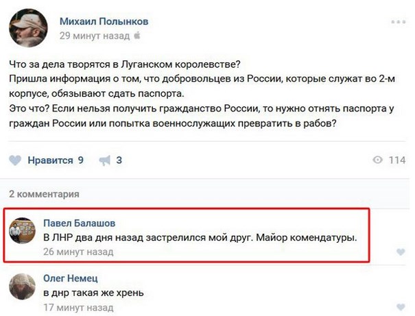 В свою очередь террорист Михаил Полынков сетует, что российских наемников в ЛНР заставляют сдать паспорта РФ: «… Попытка превратить военнослужащих в рабов?». Что ж, в России и так все царские холопы. В ответ некий Павел Балашев сообщает, что в ЛНР застрелился майор комендатуры. Смотри скрин.