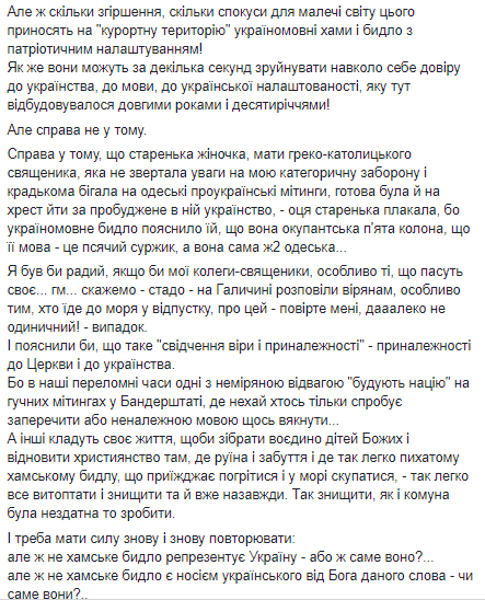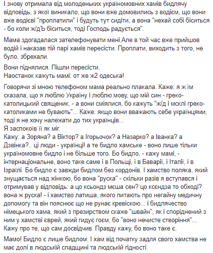 "Говоря со мной по телефону, мама реально плакала. Говорит: я им сказала, что я люблю Украину и люблю язык, что мой сын - греко-католический священник, - а они смеялись, потому что говорят "ж/д и м*скали греко-католиками не бывают" ... говорит: если считают себя украинцами, тогда я не хочу принадлежать к таким украинцам", - рассказал священник.