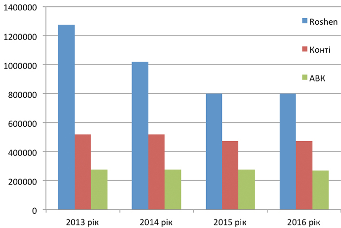 Так, Roshen з 2013 року втратила 476 тис дол, "Конті" — 47 тис дол, АВК — 6 тис дол. Таким чином, українські компанії стрімко втрачають свої позиції у світовому рейтингу. Це логічно, враховуючи економічну ситуацію в Україні.