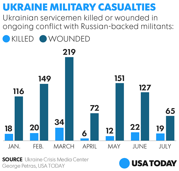 Согласно данным Украинского кризисного медиацентра в Киеве, в июле в результате обстрелов, снайперского огня и перестрелок погибли 19 украинских военнослужащих и 65 получили ранения.