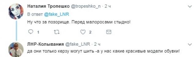 Так, пользователь выложил в Твиттер фото обуви и написал: «Новости ЛНР! Визит министра промторга „ЛНР“ на „Лугтекстильобувь“, о*уенная в „ЛНР“ обувь».