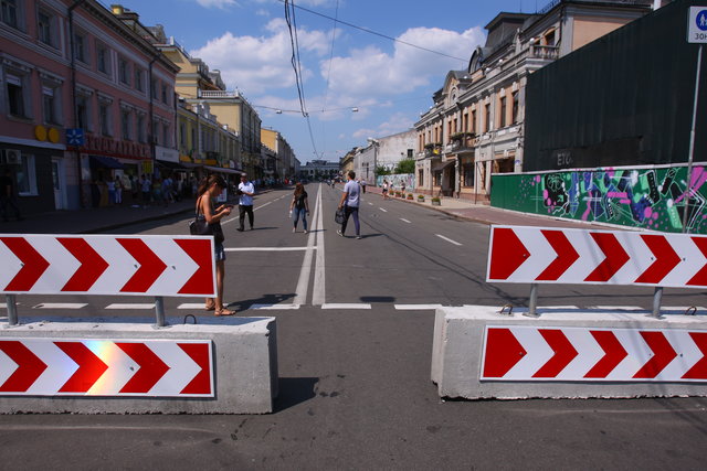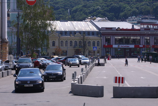 Накануне ночью возле экспериментального участка установили новые знаки и оградили пешеходную часть ул. Контрактовой и ул. Сагайдачного от "автомобильной" большими серыми бетонными блоками. Они, по словам киевлян, выглядят нелепо и "неэстетично", но зато транспорт такую преграду точно не преодолеет. Вчера, несмотря на будний день, у памятников Сковороде и Сагайдачному было многолюдно, дежурили "скорые" и полицейские — на авто и даже на велосипедах. Значительных пробок вокруг новосозданной пешеходной зоны мы не заметили. И в то же время оставленные для парковок участки и прилегающие улицы были довольно плотно заполнены авто.