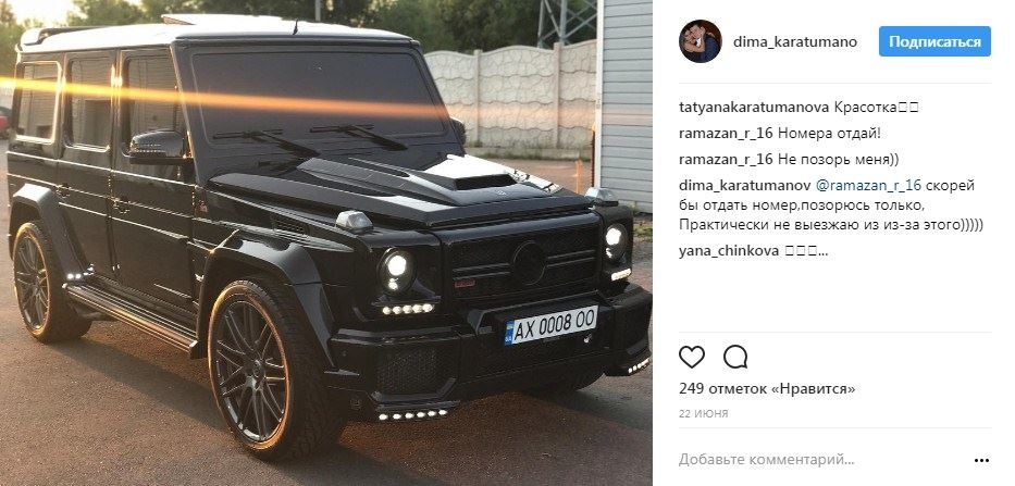 «Вчера Дмитрия Каратуманова за рулем брабусовского «гелика» на Сумской останавливают копы. Сначала водитель отказывается выходить из машины, но после все же получает свой штраф по ст. 130 КУоАП («вождение в состоянии опьянения») за отказ продуться. Дима очень любит «гелики» от тюнинг-ателье Brabus. Настолько, что даже шорт-адрес «ВКонтакте» у него brabus555. А про Instagram и говорить нечего: из 10 последних фоток на девяти – черный «гелик» (на десятой Дима засовывает в военную разгрузку вискарик)», — отметил Федосенко.