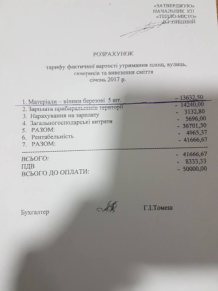 "Иршавским коммунальщикам легче подметать улицы, ведь у них самые современные березовые веники в Европе, стоимость одного березового веника составляет 2 726,5 грн. Хотелось бы увидеть какие это веники?", - пишет пользователь и выкладывает фотографию с расчетом тарифа.
