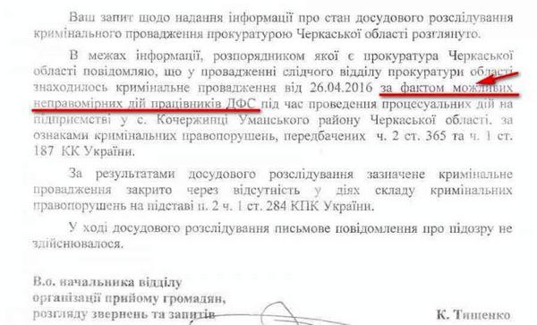 Нам указали номер уголовного производства и рекомендовали обратиться с ним в органы прокуратуры Черкасской области.