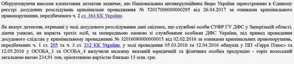 В апреле в этом году Национальное антикоррупционное бюро Украины начало уголовное производство в отношении действий работников Государственной фискальной службы в Запорожской области по ч. 2 ст. 364 УК Украины. Они, по предварительному сговору с коллегами из ДФС Украины, весной 2016 года, под предлогом проведения досудебного следствия во время обысков в частном предприятии «Герра Плюс», а также у двух предпринимателей изъяли грецкий орех общим весом 234,91 тонн и ориентировочной стоимостью около 13 млн. грн. Эти «вещественные доказательства» передали на ответственное хранение одному предприятию, а позже другому с признаками фиктивности, откуда орехи в конце концов исчезли.