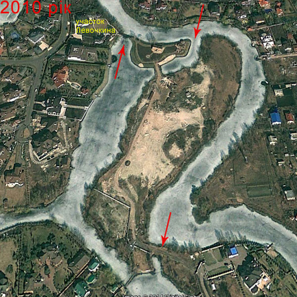 Льовочкін живе в “Золотих воротах” – одному з найперших елітних селищ під Києвом в Кончі-Заспі. Прямо навпроти будинку Льовочкіна знаходиться малий острів, до якого з ділянки Льовочкіна був перекинутий міст. Малий острів, у свою чергу, межує з великим півостровом. Таким чином, в приватну власність під забудову були передані один малий острів і один півострів. І це при тому, що Водний кодекс України містить пряму заборону на передачу островів під забудову.