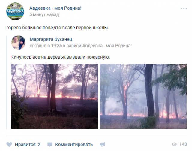 В прифронтовой Авдеевке Донецкой области возле школы № 1 загорелось спортивное поле.