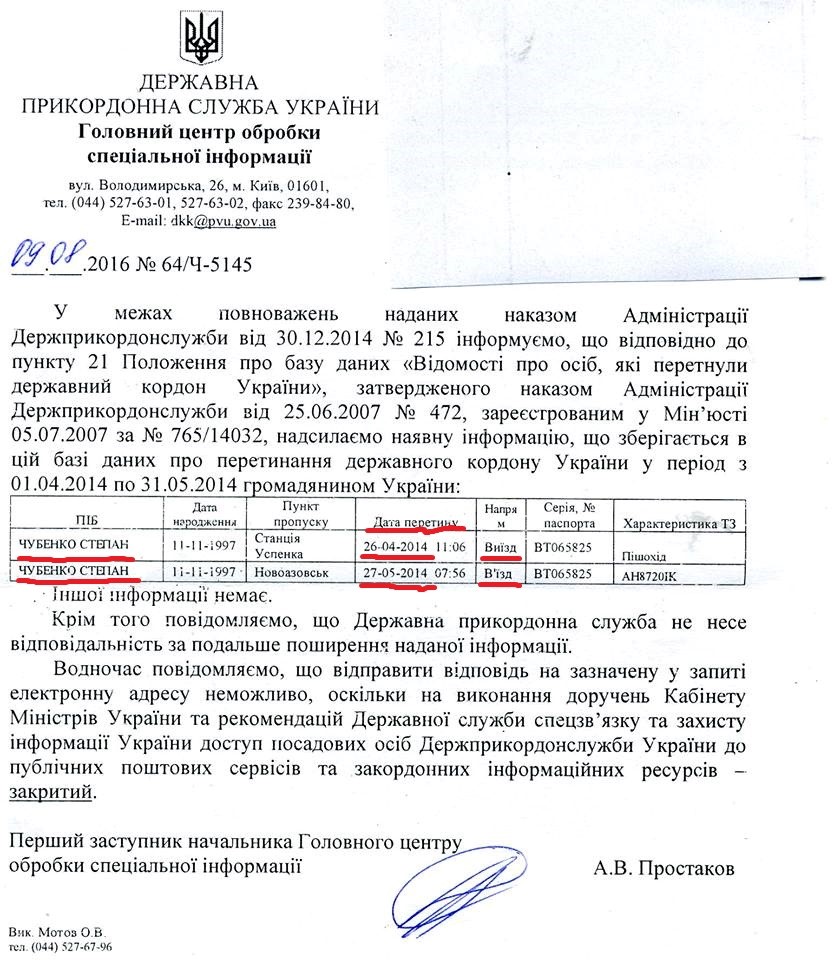 Российские журналжисты, оправдывая убийство подростка, постоянно твердят, что он участвовал в событиях в Одесском Доме профсоюзов 2 мая («сжигал антимайдановцев»). Чтобы опровергнуть ложь, мама парня получила подтверждение из Государственной пограничной службы Украины о том, что в этот период Степа не мог быть в Одессе, он находился в РФ у дедушки с 26 апреля по 27 мая.