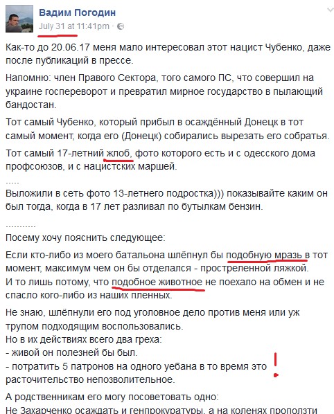 Можно не сомневаться, что справедливость настигнет Погодина и в РФ. Для Москвы он уже отработанный материал, и то, что до сих пор жив, можно отнести к казусам. Как известно, другой «герой» российской армии — Юрий Буданов, с которым сравнивают Погодина, был застрелен чеченцем. Буданов отличился во Второй чеченской войне тем, что похитил, изнасиловал и убил 18-летнюю девушку. Погодин – расстрелял похищенного 16-летнего школьника. Первый, чтобы оправдаться, называл свою жертву снайпершей, второй так же не испытывает сожаления. На своей странице в Фейсбуке называет убитого ребенка «мразью» и «животным», а родителям, советует «на коленях проползти перед жителями Донецка». Сами же российские пропагандисты и окрестили Погодина «донецким Будановым», только в их исполнении это комплимент – ведь российским «воинам» чужды такие «предрассудки», как честь.
