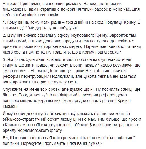 Он поделился на своей странице в соцсети Facebook историей собеседника из оккупированного полуострова. АТОшник утверждает, что положение дел в Крыму обстоит не так плохо, как сообщается в украинских СМИ. Он рассказал о беседе с жителем полуострова, который утверждает, что туризм в Крыму развивается, особенно если речь идет о городах возле Керченской переправы. Более того, по его словам, в Крым ездят отдыхатьнемало жителей Украины. Продукты на оккупированном полуострове постепенно дешевеют, а если российские не нравятся, не сложно достать украинские, которые завозятся на территорию Крыма контрабандой.
