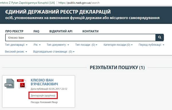 Більше того, якщо Клюзко придбав автомобіль у 2017 році, то він мав би вказати це в окремому повідомленні до НАЗК. Проте, як бачимо, крім щорічної декларації, головлікар до НАЗК нічого не подавав.