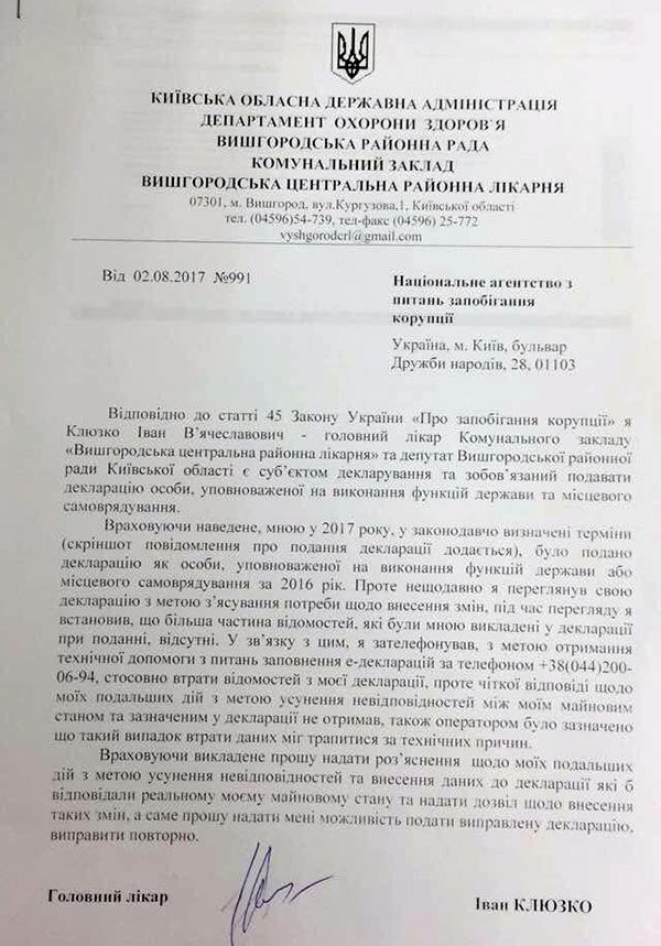 Також лікар надіслав копію свого звернення до НАЗК з проханням виправити свою декларацію. Зауважимо, що вона датована 2 серпня, тобто до інспекції райлікарні 8 серпня, коли прокурор Чібісов пообіцяв перевірити декларацію лікаря.