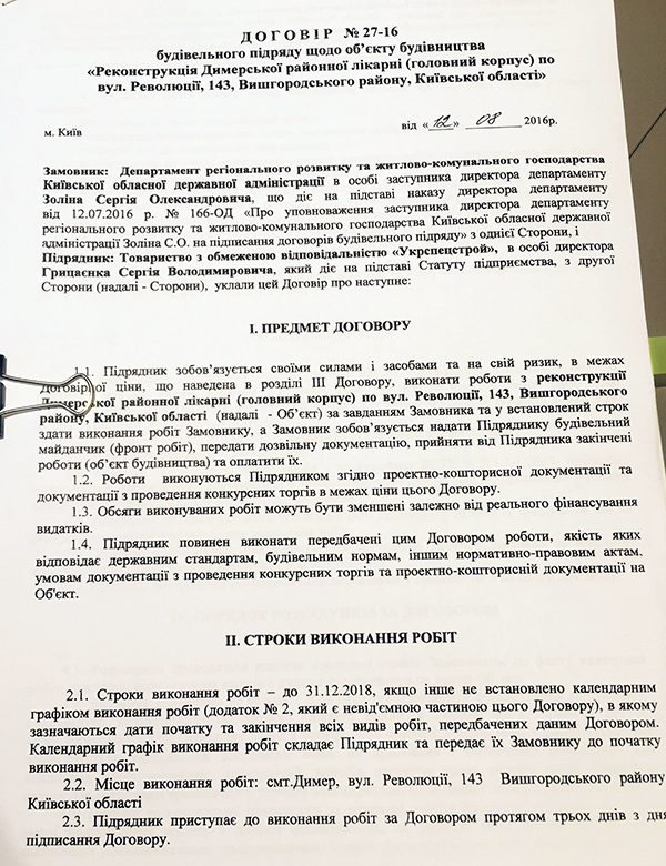 Договір будівельного підряду, який діє до кінця 2018 року, підписали на той час заступник директора Департаменту регіонального розвитку та ЖКГ КОДА Сергій Золін та директор ТОВ «Укрспецстрой» Сергій Грицаєнко. Нині Сергій Золін уже директор департаменту.