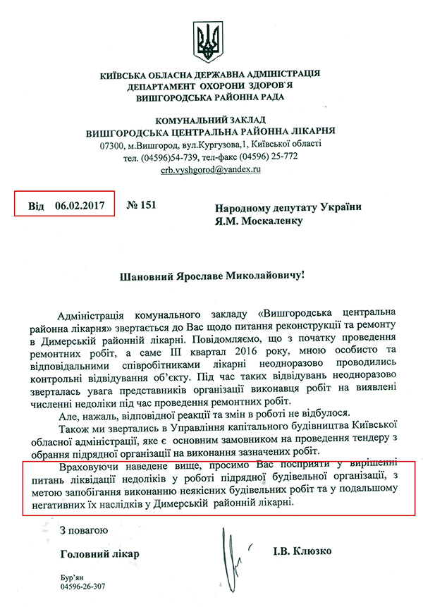 Клюзко каже, що йому постійно скаржилася на халтуру підрядників головлікар Димерської райлікарні Ольга Малашенко.
