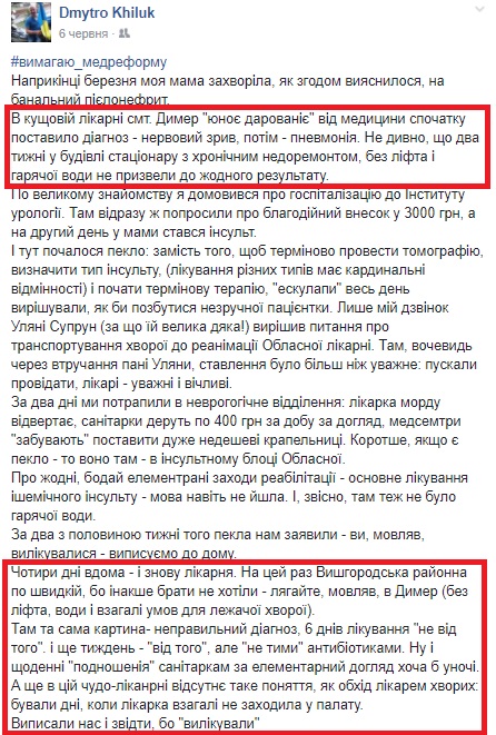 Журналіст Дмитро Хилюк через хворобу матері мав змогу переконатися в неефективності лікування і в Димерській лікарні в умовах ремонту і в Вишгородській в умовах недбалості.