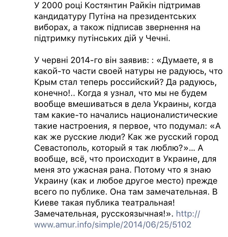 17 листопада цього року в Українському театрі м. Одеса заплановано виступ актора Костянтина Райкіна, громадянина Російської Федерації (країна-агресор).