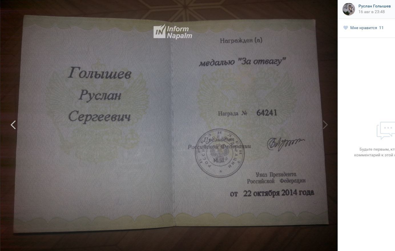 Видео, опубликованное им на странице, дает понять, что Голышев участвовал в боевых действиях в Украине, в частности в расстреле украинских военных под Иловайском, за что его и представило к награде российское командование.