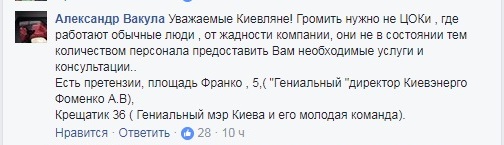 “Уважаемые Киевляне! Громить нужно не ЦОКи , где работают обычные люди, от жадности компании, они не в состоянии тем количеством персонала предоставить Вам необходимые услуги и консультации. Есть претензии? Площадь Франко , 5 (директор “Киевэнерго” Александр Фоменко), - пишет  бывший работник “Киевэнерго” Александр Вакула.