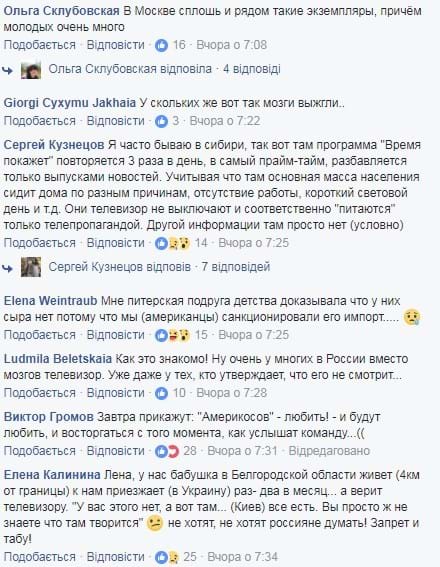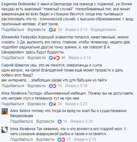 "У меня в Белгороде (на границе с Украиной, уж ближе некуда) есть знакомый "тяжелый случай". Непробиваемый тип, все винит американцев во всех бедах и страшно бесится, когда ему пытаешься растолковать что-то. Клинический случай, с высшим образованием, с виду приличный человек", - отметила Евгения Долиненко.