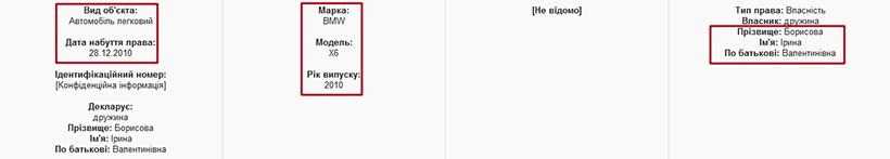 Також у власності Ірини Борисової є BMW X6 2010 року випуску. Придбала дружина прокурора цей автомобіль у тому ж 2010 році.