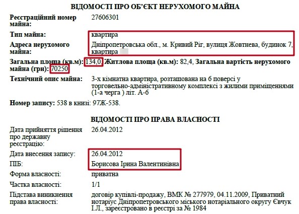 Окрім сина, нерухомістю володіє і дружина прокурора, у її власності перебуває квартира у Кривому Розі. Площа цього житла – 134 м², а вказана його вартість – 70 тис. грн. Проте сьогодні подібна квартира в цьому елітному будинку коштує не менш як 115 тис. дол. Придбала цю квартиру Ірина Валентинівна у 2012 році.