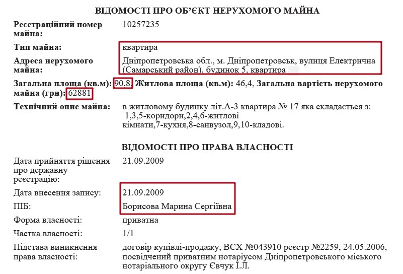 Такий цінний подарунок новонароджений отримав не від кого іншого, як від свого батька-прокурора. Про те, що ж змусило прокурора переписати два будинки на тримісячну дитину, можемо тільки здогадуватися. Варто зазначити, що після таких щедрих подарунків сину у власності самого прокурора Борисова не залишилося жодного нерухомого чи рухомого майна. Ба більше, у прокурора немає жодного житла навіть на праві користування. А це вже, очевидно, не може відповідати дійсності. Тобто Борисов однозначно порушив законодавство, не вказавши жодного права користування житлом як у Дніпрі, так і в Києві.