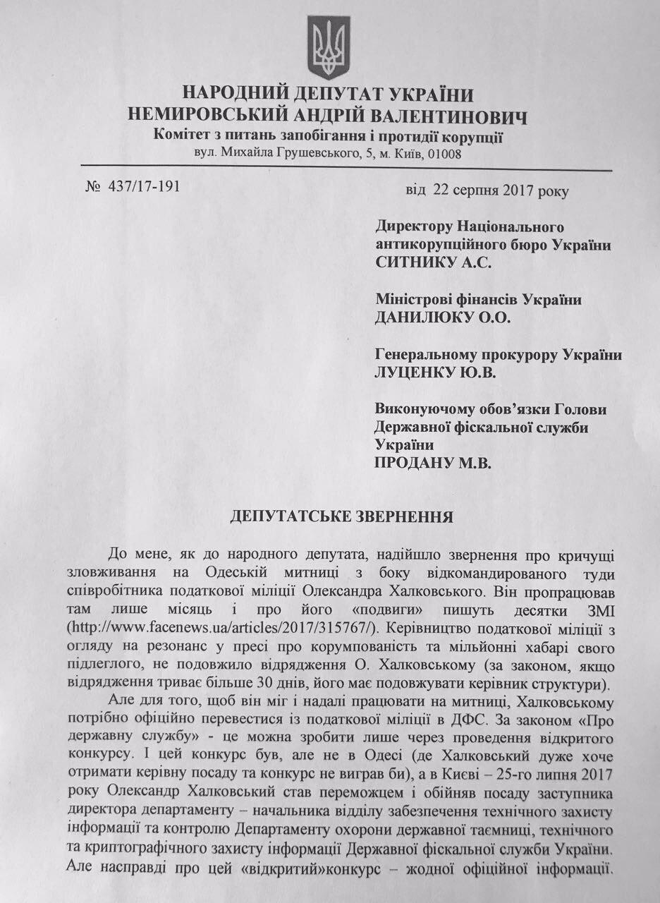 Член Комитета Верховной Рады Украины по вопросам предупреждения и противодействия коррупции Андрей Немировский обратился с официальным запросом к главе Национального антикоррупционного бюро и Генеральному прокурору Украины с требованием пресечь реализацию сомнительной схемы перевода в центральный аппарат ГФСУ одиозного сотрудника Налоговой милиции Киева Александра Халковского с целью дальнейшего назначения начальником Управления по борьбе с контрабандой и нарушением таможенных правил Одесской таможни.