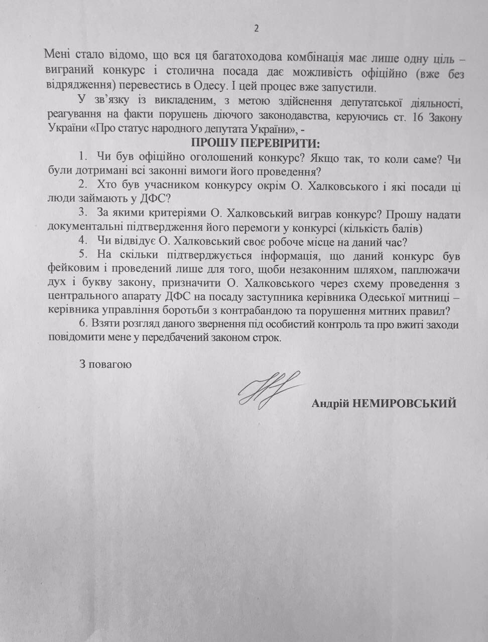 Андрей Немировский требует от ГФСУ, Минфина, НАБУ и ГПУ проверить и огласить ряд нюансов: был ли официально объявлен конкурс, когда, и все ли законные требования к его проведению были соблюдены; кто кроме Халковского принимал участие в конкурсе, и какие должности претенденты занимают в ГФСУ; по каким критериям конкурс выиграл Халковский и сколько набрал баллов; постоянно ли Халковский посещает свое новое рабочее место; правда ли, что конкурс был «фейковым» и проведен лишь с целью незаконного назначения Халковского главным «борцом» с контрабандными потоками Одессы.