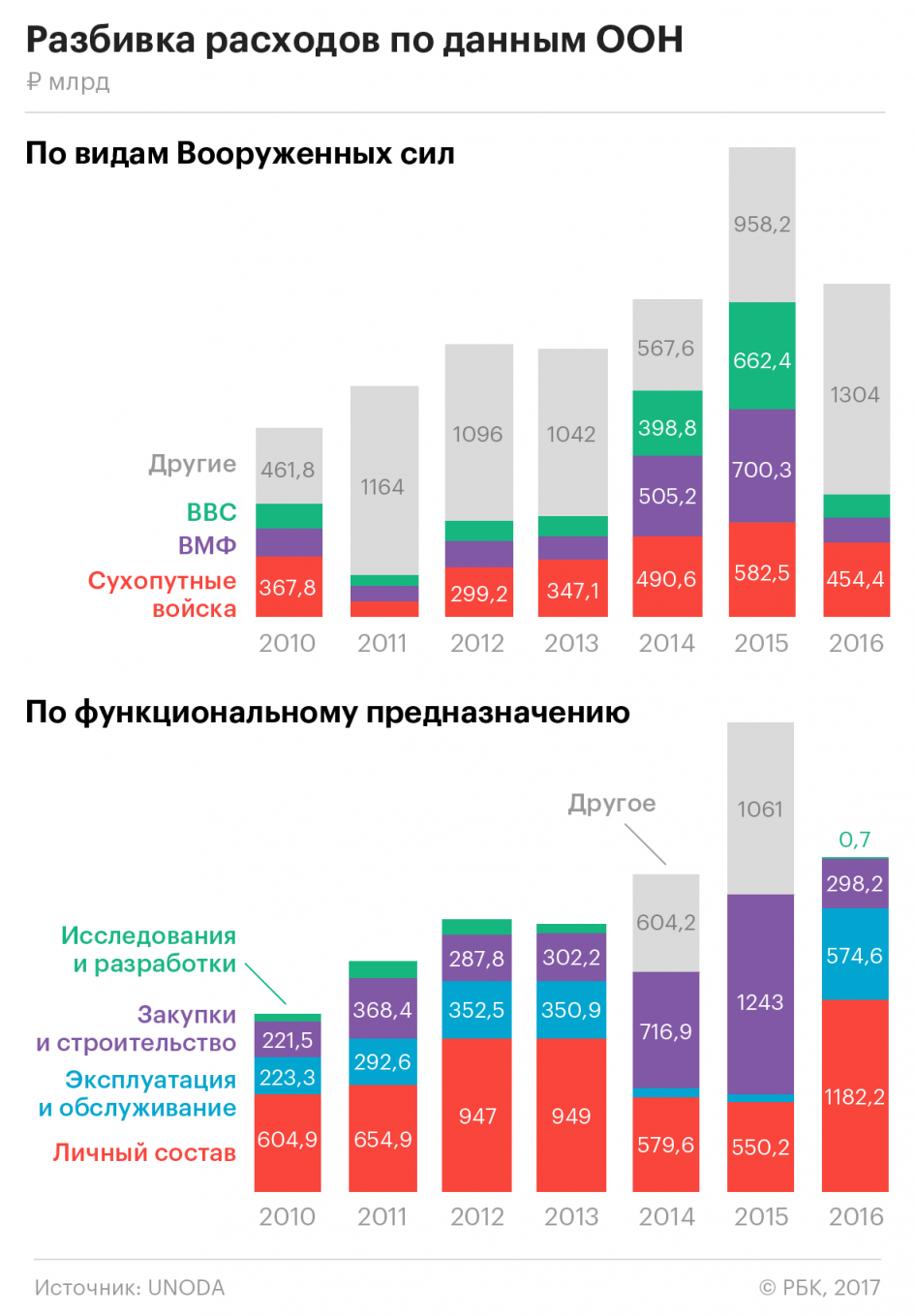 Так, как пишет РБК, согласно данным, переданным в ООН, военные расходы РФ в 2016 году сократились на 29% по сравнению с 2015 годом и составили 2,1 триллиона рублей.