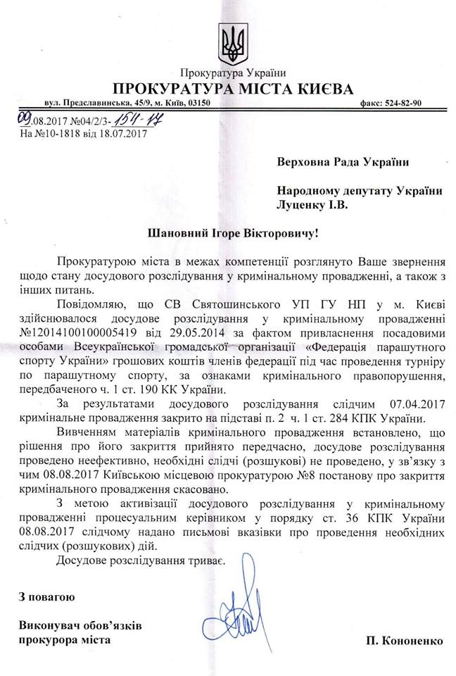 Прокуратура Києва надіслала мені лист, у якому повідомила, що 8 серпня 2017 року знову розпочато досудове розслідування фактів збору грошей з учасників державних змагань з парашутного спорту соратником Авакова та, як брешуть злі язики, його партнером по газовому бізнесу – колишнім радником харківського губернатора Добкіна, екс-депутатом Харківської обласної ради від Партії Регіонів Олегом Шаповаловим.