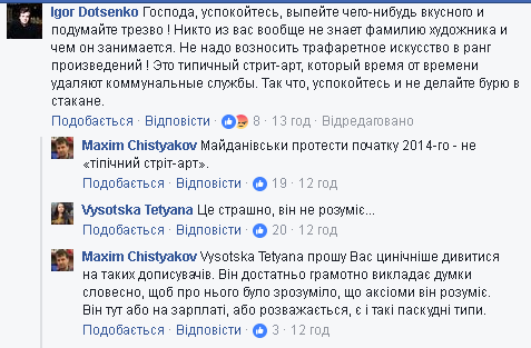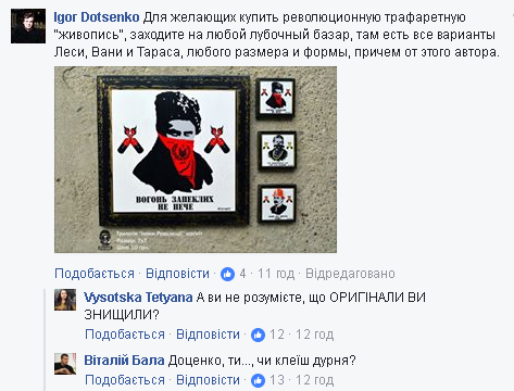 "Господа, успокойтесь, выпейте чего-нибудь вкусного и подумайте трезво ! Никто из вас вообще не знает фамилию художника и чем он занимается. Не надо возносить трафаретное искусство в ранг произведений ! Это типичный стрит-арт, который время от времени удаляют коммунальные службы. Так что, успокойтесь и не делайте бурю в стакане. Для желающих купить революционную трафаретную "живопись", заходите на любой лубочный базар, там есть все варианты Леси, Вани и Тараса, любого размера и формы, причем от этого автора", - написал он.