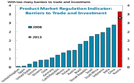 Глава 4 (аналитическая) из последнего отчёта МВФ по России выдаёт ядовитый вердикт путинской эре. Барьеры на товарном рынке являются самыми худшими среди всех крупных стран в мире. Экономика запутана в пробках. Российская модель развития «достигла своих пределов».