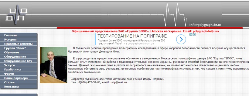 Усиков Игорь Петрович, гендиректора Укрбюро психофизиологических исследований и безопасности и, по совместительству, – бывшего председателя, а ныне члена Коллегии полиграфологов Украины (КПУ). К слову о бывшем… Бывший следователь, выйдя на пенсию после службы в милиции СУ УВД Луганской области, оставил о себе много неприятных воспоминаний, бывшие коллеги характеризуют его как мелочного, обидчивого и мстительного.