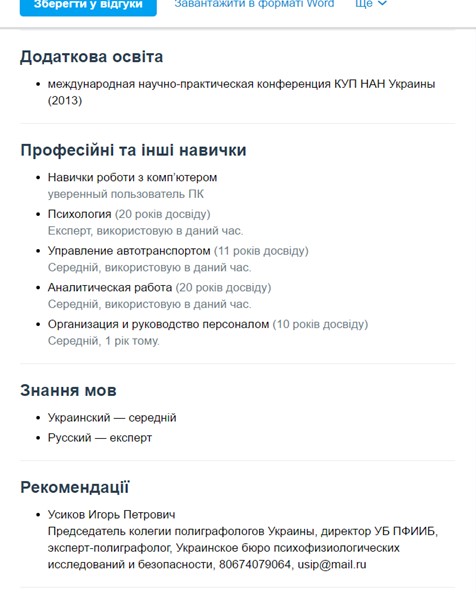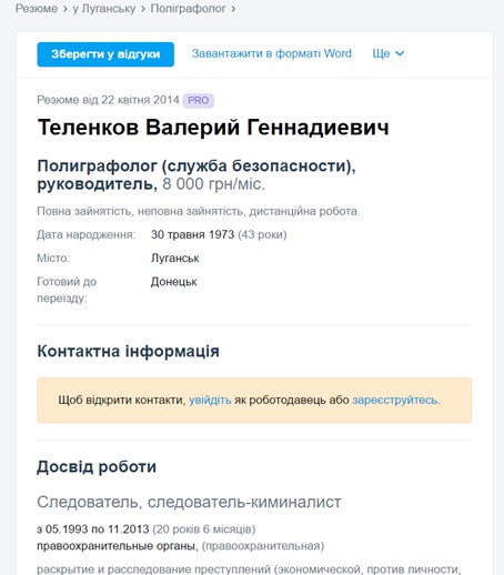 Из резюме за 2013 год следует, что работал в Луганском УМВД, на должности следователя, ушел на пенсию, обучился на полиграфолога. За рекомендацией отсылает потенциальных работодателей к Усикову И.П. Полная идиллия. Карьера, как и у его учителя, не хватило только ума вовремя сбежать в Киев к «укропам».