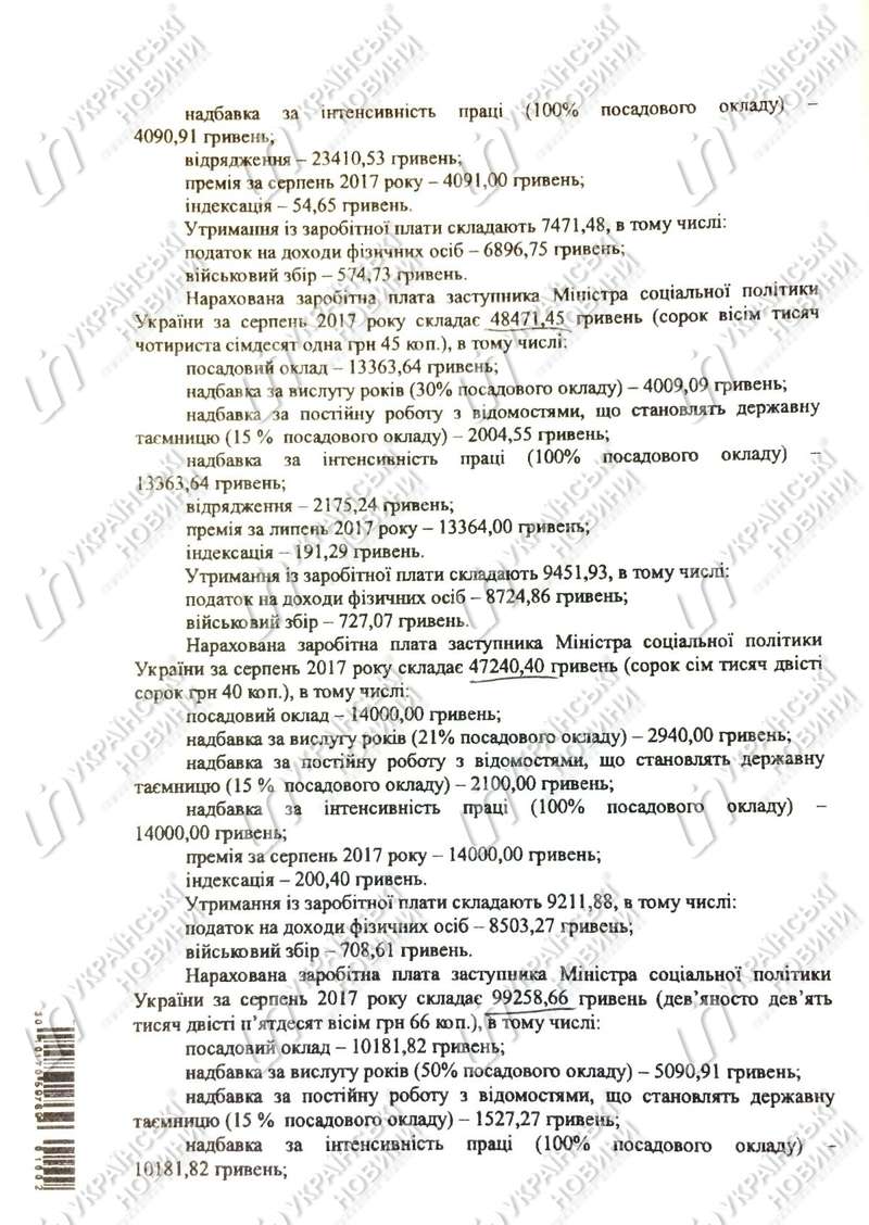 Зарплата первого заместителя министра Ольги Крентовской составила 38 315,28 гривень, заместителей Натальи Федорович, Николая Шамбира и Александра Привалова от 47 240,4 гривень до 99 258,66 гривень (кому сколько в ответе не указано) и госсекретаря Виктора Иванкевича - 93 787,62 гривень.