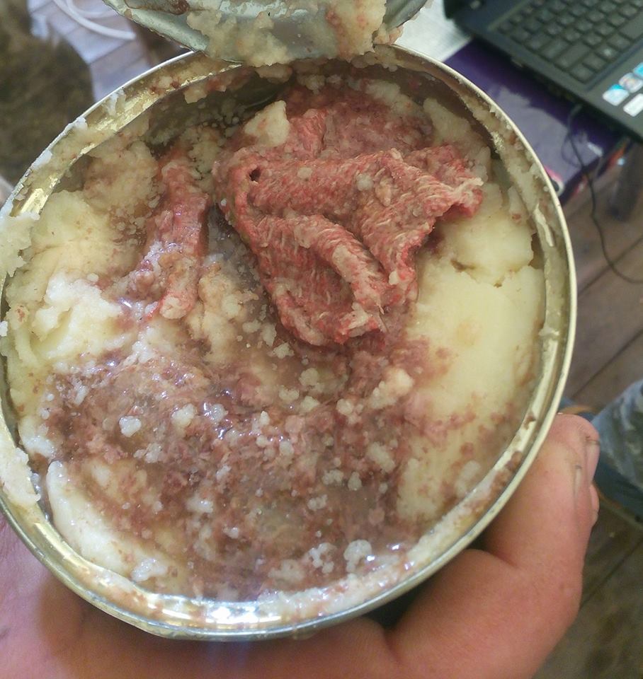 На видео, которое сняли бойцы батальона, видно как в тушенке закатана рабочая синтетическая перчатка оранжевого цвета.