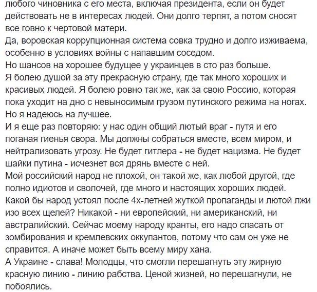 Он также сообщил, о том, чем Украине принципиально отличается от России.Об этом сообщает "Диалог.ua". "Скажу важное. Меня предупреждали, что на украинской земле меня ждут большие разочарования. Завтра 2 месяца, как я в Украине - постоянно в Киеве и один раз был в Одессе. Да, здесь все очень непросто", - сообщил россиянин, отметив, что Украину гложет множество проблем: отсутствие патриотизма у властей, коррупция и прочее. "Но. Есть огромное и бесспорное, в корне отличительное от России "НО".