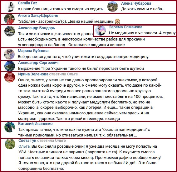 8. Ватники продолжают радоваться медицине (это комментарии к предыдущему пункту): “В наши больницы только за смертью ходить”, “Да хоть камни с неба”, “Заболел — застрелись (с). Девиз нашей медицины”, “Не медицину в чёрный список заноси, а страну”, “Так и хотят изжить — это известно давно. Есть необходимость в некотором количестве рабов для прокачки углеводородов на Запад. Остальные людишки лишние”, “Всё делается для того, чтоб уничтожить государственную медицину”, “Выражение «При Украине такого не было» перестаёт быть шуткой”, “У меня не так давно прооперировали знакомую. Я смело могу сказать, что даже по какой-то там льготной очереди она всё равно заплатила довольно круглую сумму. Может быть, кто-то как-то и получает медуслуги бесплатно, но это не массово, а, скорее, выборочно, как лотерея. И еще… такие операции в Украине намного дешевле сейчас, чем здесь. А на материке — дороже. Так что делайте выводы, господа”, “Так прикол в том, что мне нах не нужна эта «бесплатная медицина» с такими приколами, но отказаться нельзя, т.к. обязательная”, “Я уже два месяца не могу попасть на УЗИ. Частные клиники — не вариант (зарплата не та). К окулисту смогла попасть по записи только через месяц. Про маммографию вообще молчу! Я точно знаю, что при другой бытности такого не было! И да! Это было совершенно бесплатно” (скрин).