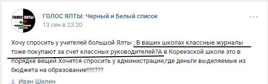 9. Когда работаешь учителем в самой бАгатой стране мира, а учителя в остальных странах тебе завидуют: “Хочу спросить у учителей Большой Ялты: в ваших школах классные журналы тоже покупают за счёт классных руководителей? А в Кореизской школе это в порядке вещей. Где деньги, выделяемые из бюджета на образование!!!!!???” (скрин).