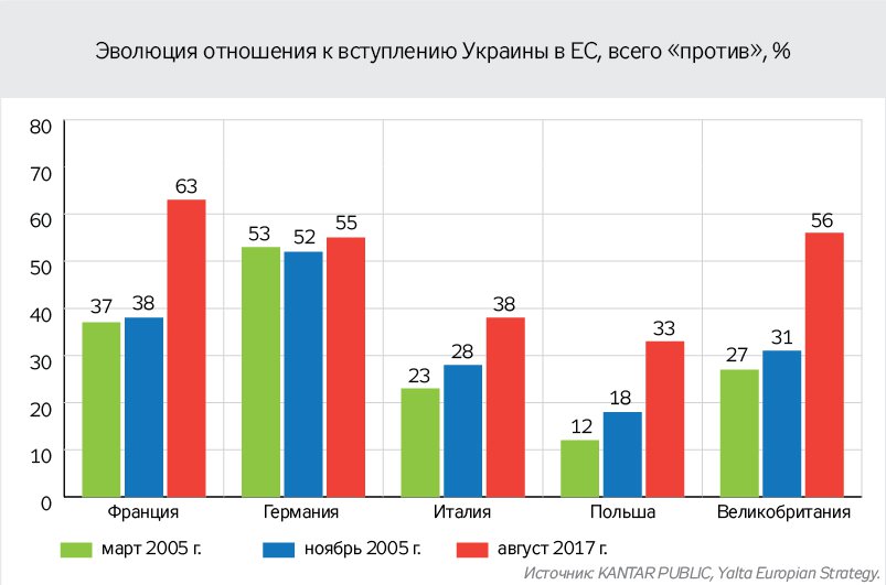 Согласно результатам социологического опроса, проведенного по заказу YES и Фонда Виктора Пинчука в августе парижским отделением Kantar Public, европейцы разделились в своем отношении к вступлению Украины в Европейский союз: 48% поддерживают этот процесс, а остальные 52% — против.