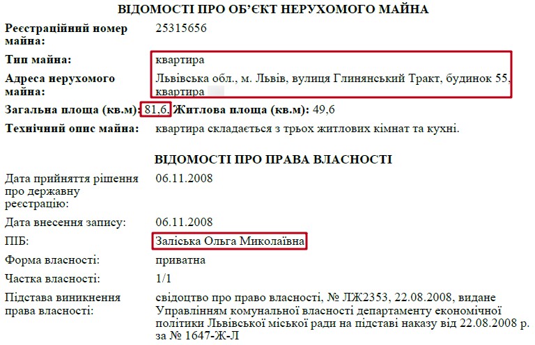 Також дружина прокурора має квартиру в Львові на вулиці Глинянський Тракт, 55.Помешкання площею 81 м² коштувало Ользі Заліській 170 тис. грн. У сусідньому будинку дружина прокурора також має гараж.